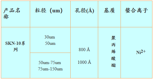规格型号:SKN系列亲和层析介质 简介:1、耐高压,高结合容量,高稳定性。 2、适用于含组氨酸的各种蛋白质的分离纯化。 3.孔径和粒径均一:分辨率高,良好实验重现,易于放大,质量稳定。